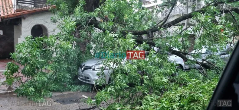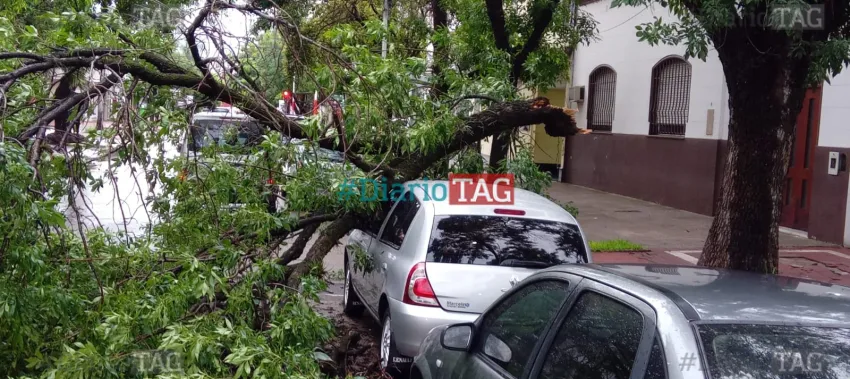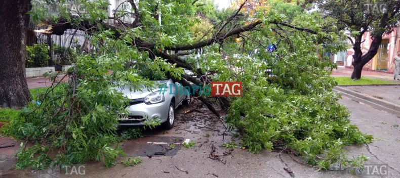 Es por ello, que, se registraron destrozos por la ciudad, y uno de ellos fue en pleno centro, más precisamente sobre la calle Pellegrini al 250 cuando un árbol cayó sobre un auto Renault Clio color gris.
