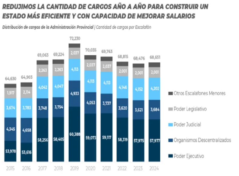 Lo cierto es que recibimos una administración con 72.630 agentes y entregamos la administración con 68.065. Es decir, una administración con 4.565 agentes menos, producto de la eliminación de cargos por jubilaciones, retiros, renuncias y/o fallecimientos.