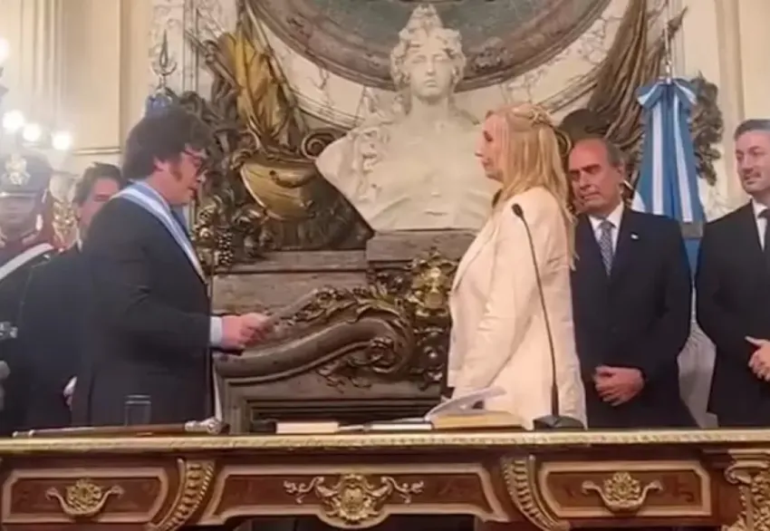 "Licenciada Karina Elizabeth Milei, ¿Jurás por Dios y por la Patria, sobre estos Santos Evangelios, desempeñar con lealtad y patriotismo secretaria general de la Presidencia de la Nación para el que has sido nombrada, cumpliendo y haciendo cumplir en cuento a vos dependa la Constitución de la Nación Argentina?", leyó Milei entre nervios y emoción.