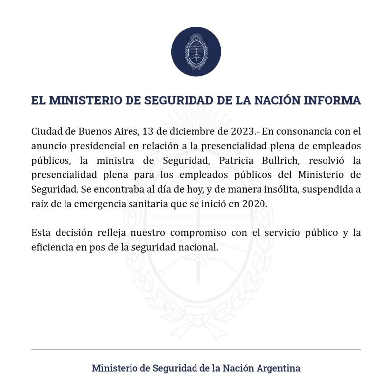 En el comunicado, indica: "En consonancia con el anuncio presidencial sobre la presencialidad plena de los empleados públicos, la ministra de Seguridad, Patricia Bullrich, resolvió implementar la presencialidad plena para los empleados del Ministerio de Seguridad".