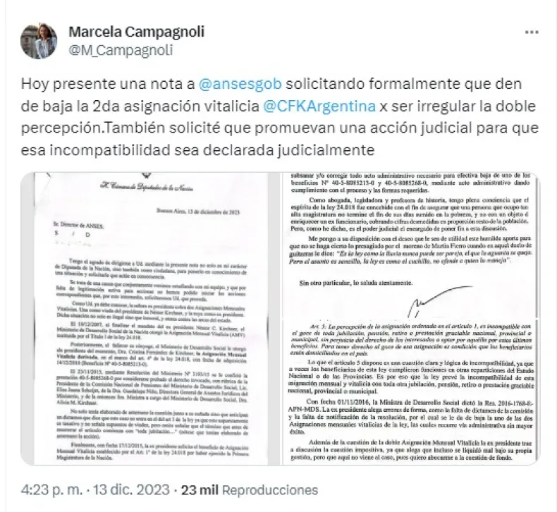 "Hoy presente una nota a ANSES solicitando formalmente que den de baja la segunda asignación vitalicia a Cristina Fernández de Kirchner por ser irregular la doble percepción. También solicité que promuevan una acción judicial para que esa incompatibilidad sea declarada judicialmente", expuso en X, Campagnoli.