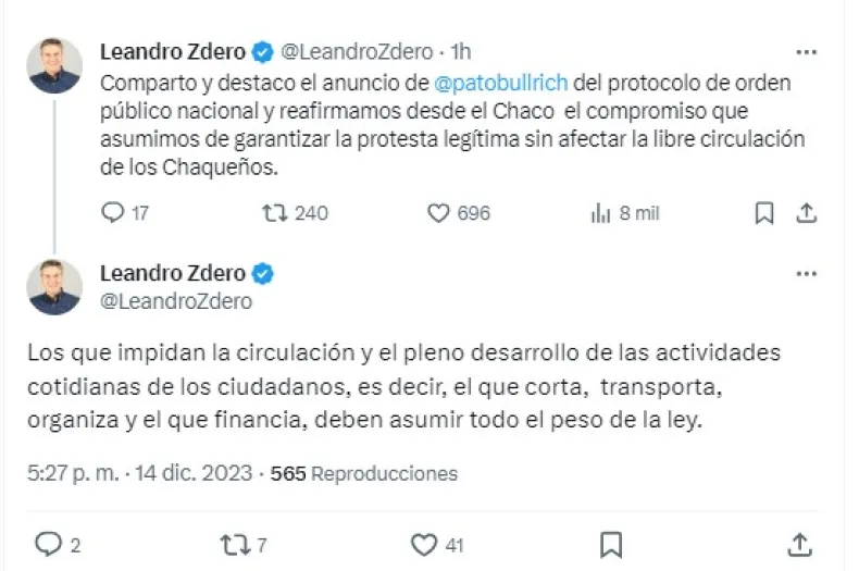 En su primer posteo, Zdero expresó: "Comparto y destaco el anuncio de Patricia Bullrich sobre el protocolo de orden público nacional, reafirmando desde el Chaco el compromiso que asumimos de garantizar la protesta legítima sin afectar la libre circulación de los chaqueños".