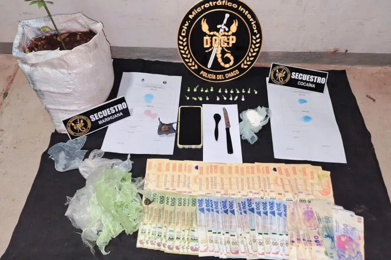 En la primera vivienda, hallaron a una mujer de 24 años, una de las principales investigadas, quien resultó detenida luego de haberse encontrado 22 envoltorios de cocaína con un pesaje de 44 gramos, una bochita con marihuana, una planta Cannabis Sativa de 50cm de altura, un celular y $35.940 en efectivo.