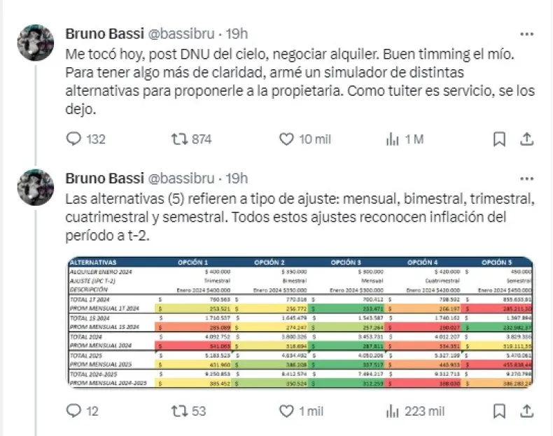 "Me tocó hoy, post DNU del cielo, negociar alquiler. Buen timming el mío. Para tener algo más de claridad, armé un simulador de distintas alternativas para proponerle a la propietaria. Como tuiter es servicio, se los dejo", dijo Bruno Bassi abrió un hilo en X.