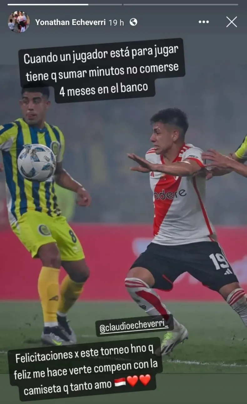 Yonathan Echeverri, hermano de Claudio, realizó un posteo donde recriminó las acciones del actual técnico de River. "Cuando un jugador está para jugar tiene que sumar minutos, no comerse cuatro meses en el banco", escribió junto a una foto del Diablito ante Rosario Central.