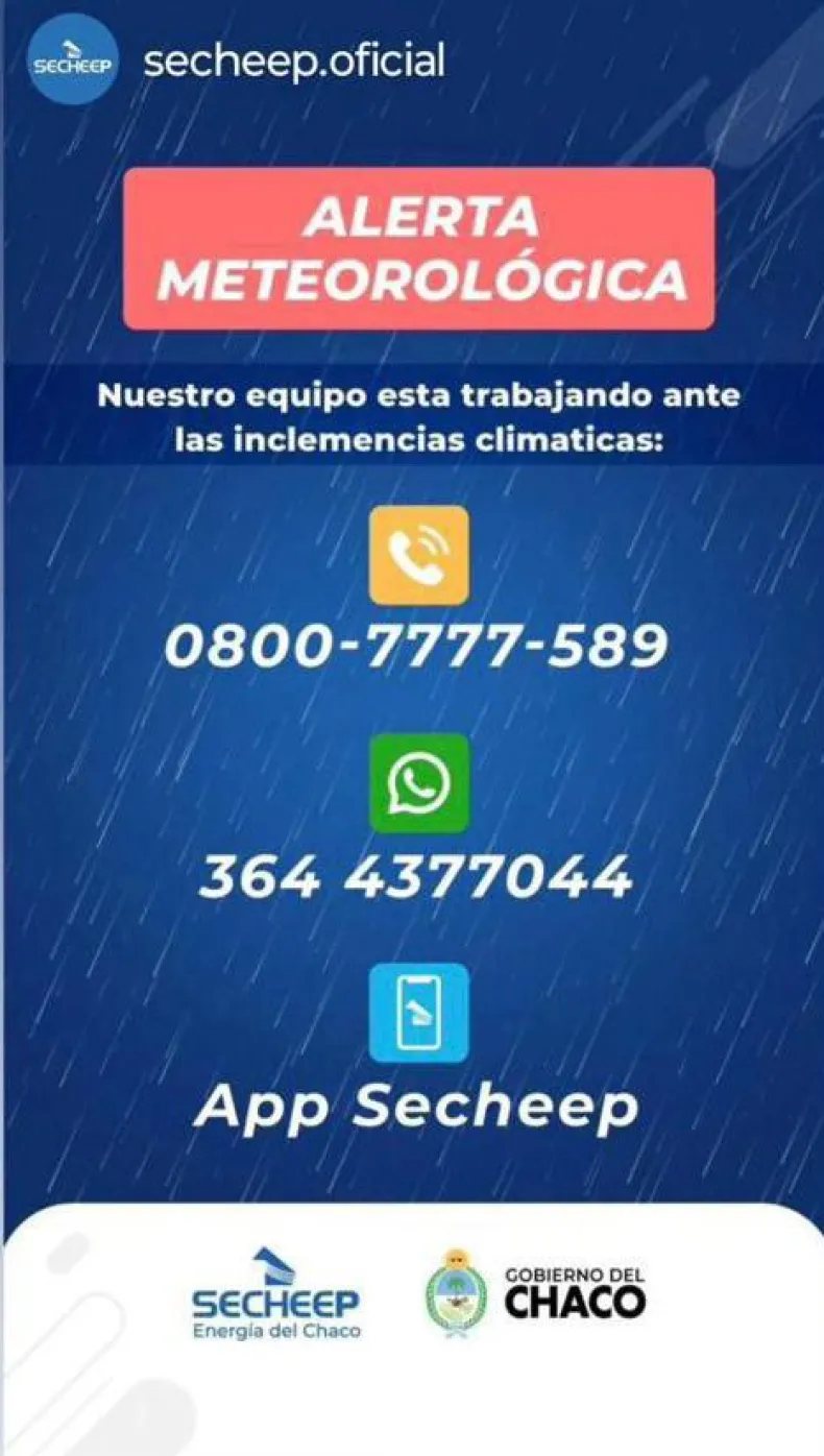 En este contexto, Secheep informó que trabaja ante las inclemencias climáticas y difundió las vías de contacto para quien lo necesite, llamados al 0800-7777-589, mensajes de WhatsApp al 3644377044 o en la app de Secheep en celulares.
