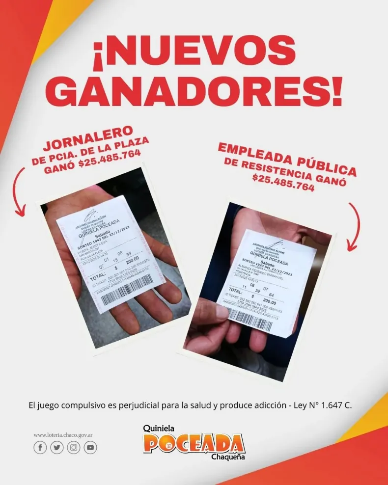 Dos personas una oriunda de Resistencia y otra de Presidencia de la Plaza fueron los ganadores del pozo de 50 millones de pesos de la Quiniela Poceada.
