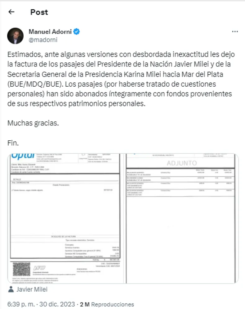 Manuel Adorni difundió los comprobantes a través de la red social X y aclaró que las erogaciones que superaron los 937 mil pesos fueron costeadas con los patrimonios de Javier Milei y su hermana Karina.