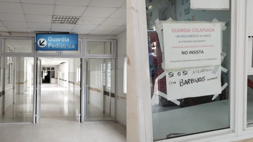 Un cartel en la ventanilla de la Guardia Pediátrica del Hospital 4 de Junio advierte a los padres que la "guardia está colapsada, hay un solo médico a cargo y se atenderán sólo urgencias y derivaciones". A la vez, informan que esta situación se da de manera general en todo el nosocomio.