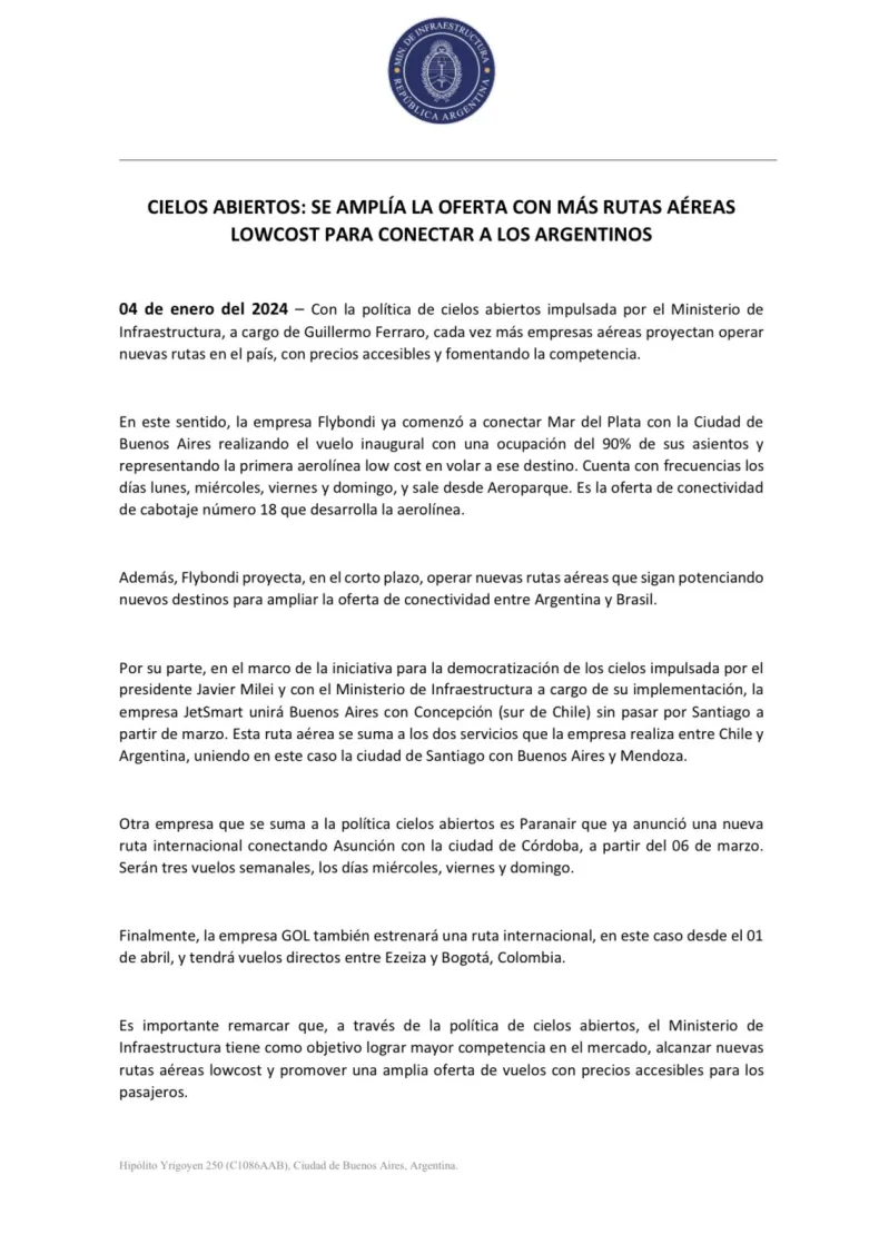 "Se amplía la oferta con más rutas aéreas low cost para conectar a los argentinos", dice el comunicado publicado por el Ministerio de Infraestructura a través de la red social X. Seguido Agrega: "Con la política de cielos abiertos, cada vez más empresas aéreas proyectan operar nuevas rutas en el país, con precios accesibles y fomentando la competencia".