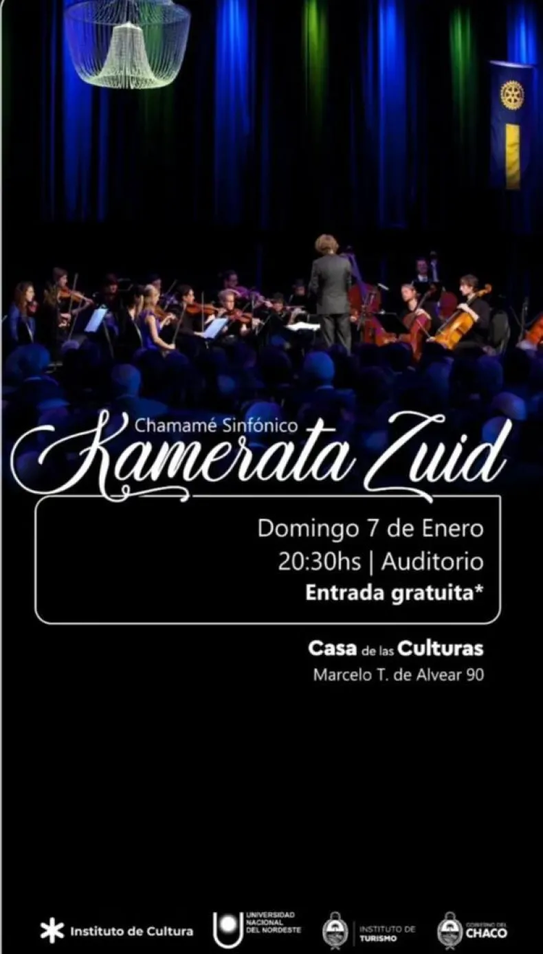 El conjunto sinfónico holandés, Kamerata Zuid, visitará la provincia este domingo a las 21 horas y realizará durante la noche un show de Chamamé Sinfónico en la Casa de las Culturas, sobre Marcelo T. de Alvear 90, con entrada libre y gratuita.