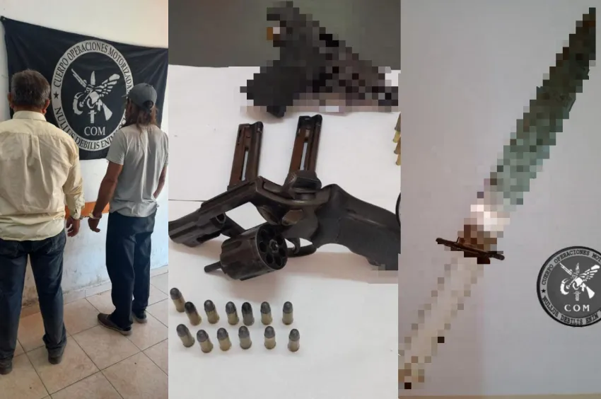 Allí se hizo presente personal del Grupo C.O.M., donde observaron a dos hombres salir de los matorrales, los mismos llevaban consigo un arma blanca, un revólver marca Rexio calibre 32 que contenía siete cartuchos del mismo calibre sin percutar marca S&W, como así también una pistola marca Bersa Thunder calibre 22 LR, cargador marca Bersa colocado, con la cantidad de 10 cartuchos marca "OA" sin percutar.