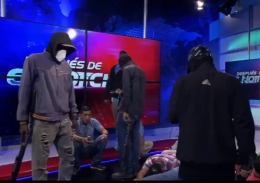 La cadena ecuatoriana TC fue interrumpida esta tarde, por un ataque de una banda criminal que obligó a todos los trabajadores tumbarse al suelo. Todo el hecho quedó registrado por las cámaras que aún seguían transmitiendo en vivo. Minutos más tarde, el presidente Daniel Noboa declaró el estado de excepción en el país.