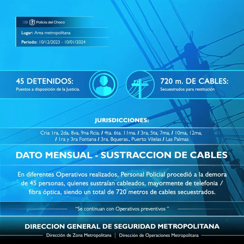 Es por ello, que en las distintas intervenciones las Comisarias que dependen de la Dirección General de Seguridad Metropolitana, en el periodo 10 de diciembre de 2023 hasta el 10 de enero de 2024, detuvieron a un total de 45 personas y secuestraron 720 metros de cables.