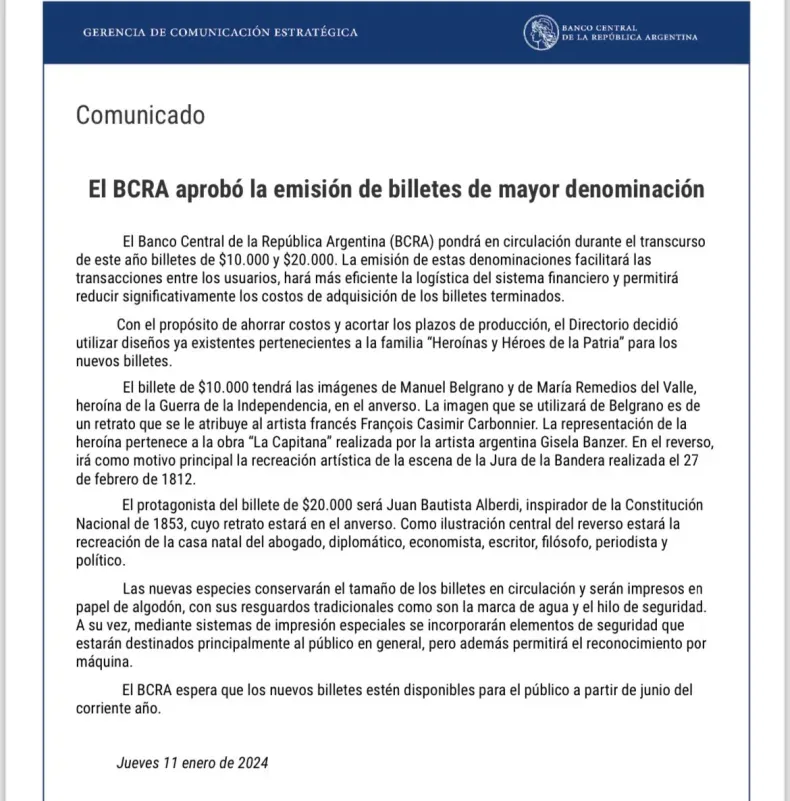 A través de un comunicado, el BCRA expresó: "facilitará las transacciones entre los usuarios, hará más eficiente la logística del sistema financiero y permitirá reducir significativamente los costos de adquisición de los billetes terminados".