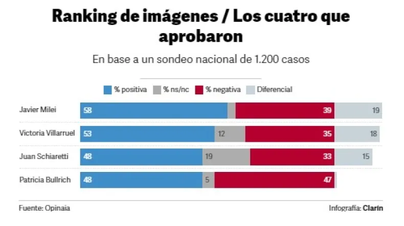 Los líderes de la tabla con resultados positivos fueron el presidente y la vice. Milei, con un diferencial de 19 puntos a favor y Villarruel, con + 18. El primero combina 58% de positiva y 39% de negativa; y la segunda, 53% y 35% respectivamente.
