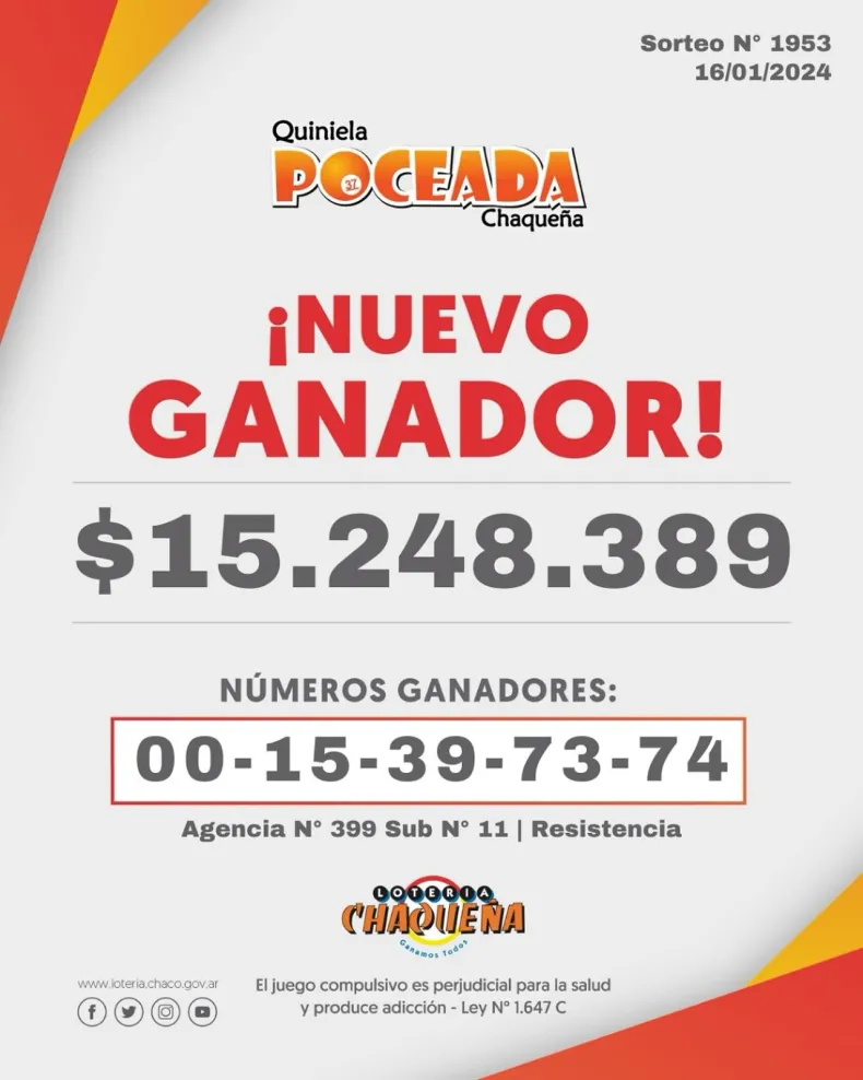 Se trató del sorteo número 1953 de la Poceada Chaqueña del día martes 16 de enero de 2024 y en esta ocasión el ganador recibió un total de $ 15.248.389.