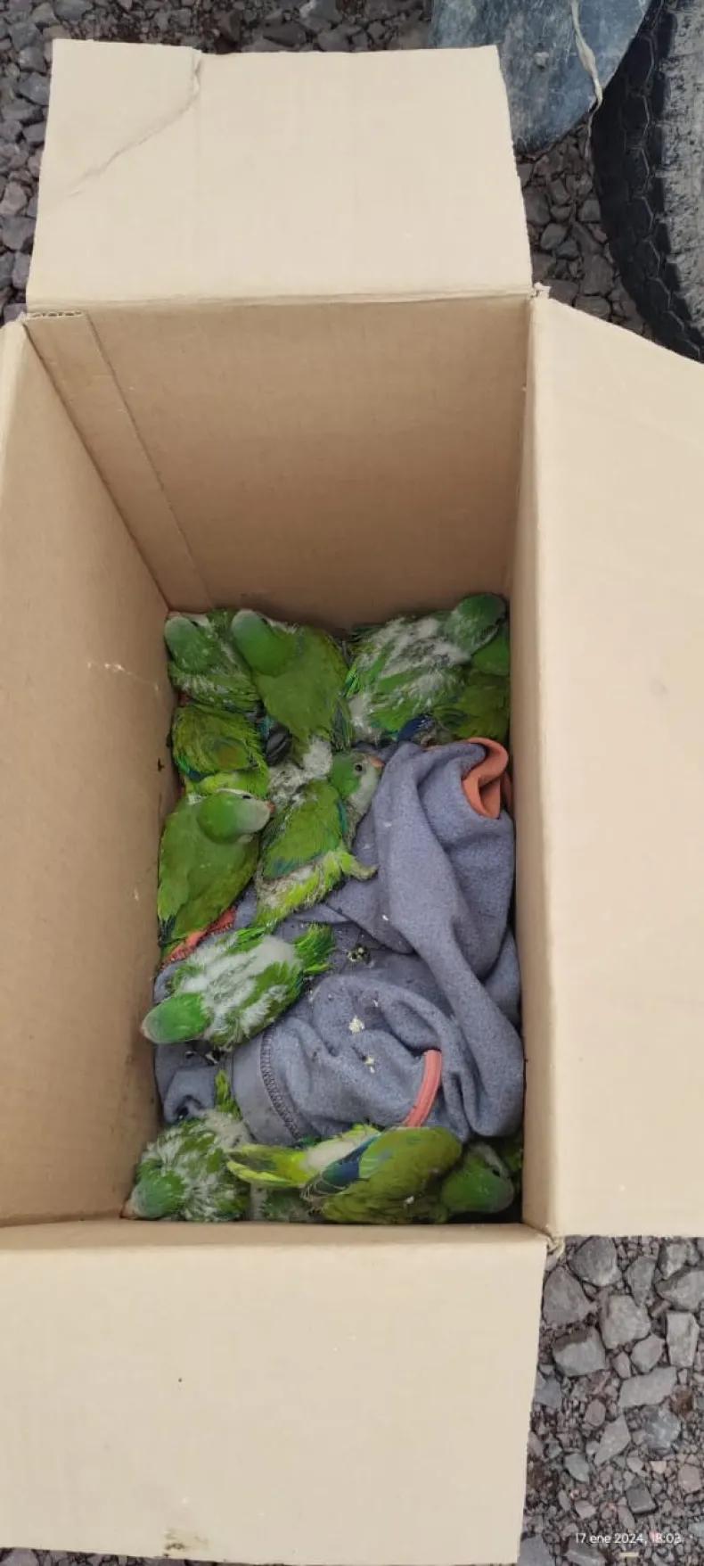 Luego de frenar el paso del motociclista, los uniformados procedieron a revisar las pertenencias del sujeto de 35 años. En ese momento, los agentes notaron que dentro de la caja de cartón había 16 cotorras que eran transportadas para ser vendidas.