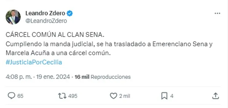 En el marco de los traslados de Emerenciano Sena y Marcela Acuña a cárceles comunes, el gobernador de la provincia, Leandro Zdero, realizó un posteó en la red social X y celebró el accionar de la Justicia contra los principales involucrados en el femicidio de Cecilia Strzyzowski.