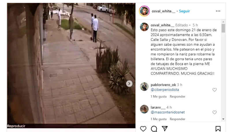 El usuario @ osval_white._ escribió en su cuenta de Instagram: "Esto paso este domingo 21 de enero de 2024 aproximadamente a las 6:30am, Calle Salta y Donovan. Por favor si alguien sabe quiénes son me ayudan a encontrarlos. Me patearon en el piso y me rompieron la nariz para robarme la billetera. El de gorra tenía unos pares de tatuajes de Boca en la pierna ME AYUDAN MUCHISIMO COMPARTIRNDO. MUCHAS GRACIAS!!".