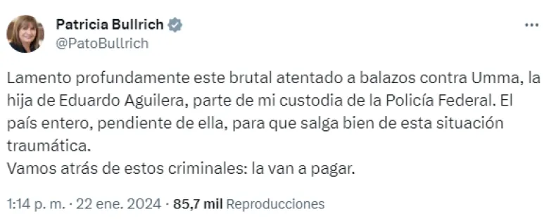 "Lamento profundamente este brutal atentado a balazos contra Umma, la hija de Eduardo Aguilera, parte de mi custodia de la Policía Federal. El país entero, pendiente de ella, para que salga bien de esta situación traumática".