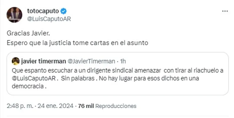 El discurso presentado por el referente de Camioneros rápidamente se hizo eco y causó un gran revuelo. Incluso, el propio encargado de la cartera económica que salió a responder la advertencia: "Espero que la justicia tome cartas en el asunto", dijo, al citar un posteo de Javier Timerman en el cual sostuvo: "Que espanto escuchar a un dirigente sindical amenazar con tirar al riachuelo a Luis Caputo. Sin palabras. No hay lugar para esos dichos en una democracia".