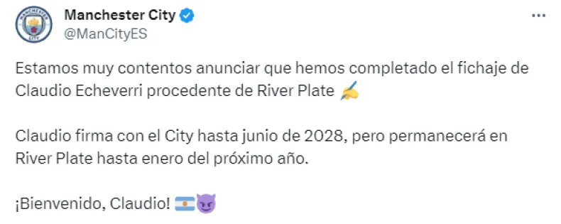 "Estamos muy contentos anunciar que hemos completado el fichaje de Claudio Echeverri procedente de River Plate Claudio firma con el City hasta junio de 2028, pero permanecerá en River Plate hasta enero del próximo año", expresó el cuadro inglés en las redes sociales oficiales.