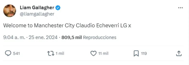 "Bienvenido al Manchester City Claudio Echeverri", escribió el cantante en su cuenta de X, anteriormente Twitter. El futbolista se unirá al club inglés recién en enero de 2025, ya que durante todo el año permanecerá a préstamo en River.