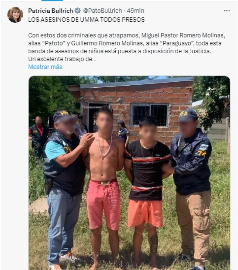 Por su parte, Patricia Bullrich posteó: "LOS ASESINOS DE UMMA TODOS PRESOS. Con estos dos criminales que atrapamos, Miguel Pastor Romero Molinas, alias "Patoto" y Guillermo Romero Molinas, alias "paraguayo", toda esta banda de asesinos de niños está puesta a disposición de la Justicia. Un excelente trabajo de investigación de la Policía Federal Argentina para que Umma tenga justicia. Hoy empiezan a pagar por todo el sufrimiento que causaron", expresó la ministra.