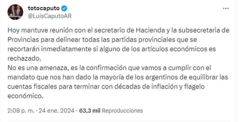 Ayer, el titular de la cartera económica, advirtió a los representantes provinciales sobre cambios en los fondos si sus diputados no acompañan la aprobación de la Ley de Bases. "Hoy mantuve reunión con el secretario de Hacienda y la subsecretaria de Provincias para delinear todas las partidas provinciales que se recortarán inmediatamente si alguno de los artículos económicos es rechazado", publicó Caputo en X.