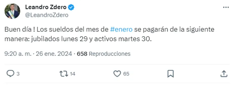 En su cuenta de X Leandro Zdero escribió: "Buen día! Los sueldos del mes de #enero se pagarán de la siguiente manera: jubilados lunes 29 y activos martes 30".