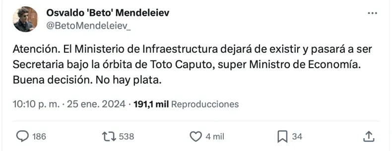 Esta acción de Gobierno ya había sido insinuada ayer por la noche, cuando el propio Javier Milei le dio "Me gusta" a una publicación en la red social X, donde vaticinaban la información. "Atención. El Ministerio de Infraestructura dejará de existir y pasará a ser Secretaria bajo la órbita de Toto Caputo, super Ministro de Economía. Buena decisión. No hay plata", había tuiteado el usuario Osvaldo ‘Beto’ Mendeleiev.