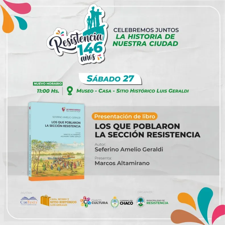 Este sábado 27, en la Casa y Sitio Histórico Luis Geraldi, ubicada en Santa Fe y avenida Antelo, se presentará una edición re-editada del histórico libro "Los que poblaron la sección Resistencia" del difunto escritor Stefano Amelio Geraldi. El evento que se da en el marco de las celebraciones por los 146 años de la ciudad de Resistencia iniciará a las 11 de la mañana. La entrada es libre y gratuita.