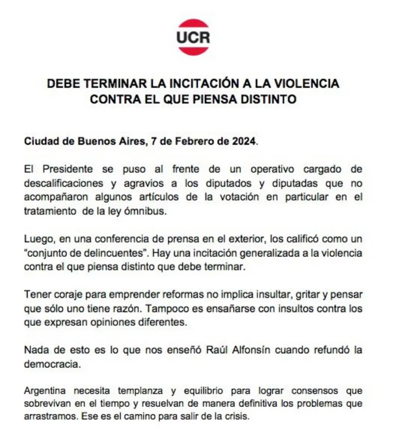 A través de un comunicado, la Unión Cívica Radical se pronunció sobre las acusaciones de Javier Milei a varios diputados del espacio tras la vuelta a comisiones de la Ley Ómnibus. "Hay una incitación generalizada a la violencia contra el que piensa distinto que debe terminar", señalaron desde el partido centeanrio.
