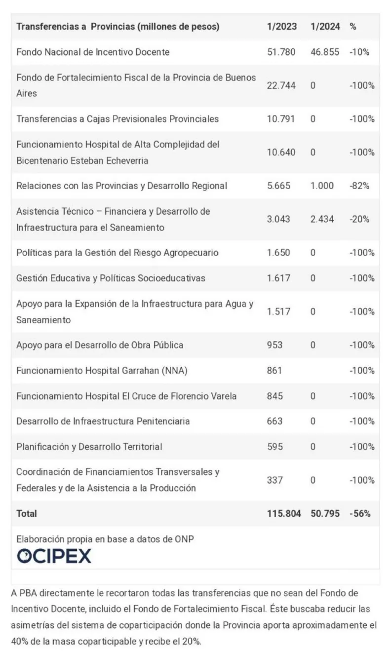 Fuentes del Ministerio de Salud aseguran que "todo continúa con normalidad" y que "los fondos destinados a los hospitales están garantizados", aunque no han proporcionado datos que refuten lo expuesto en el informe de Ocipex. Según este último, el recorte presupuestario a las provincias, especialmente a Buenos Aires, alcanza el 56% en términos reales en comparación con el mismo período del año anterior. Esto ha implicado la eliminación de transferencias de recursos para cajas previsionales provinciales, infraestructura hospitalaria, políticas educativas y penitenciarias, entre otras áreas.