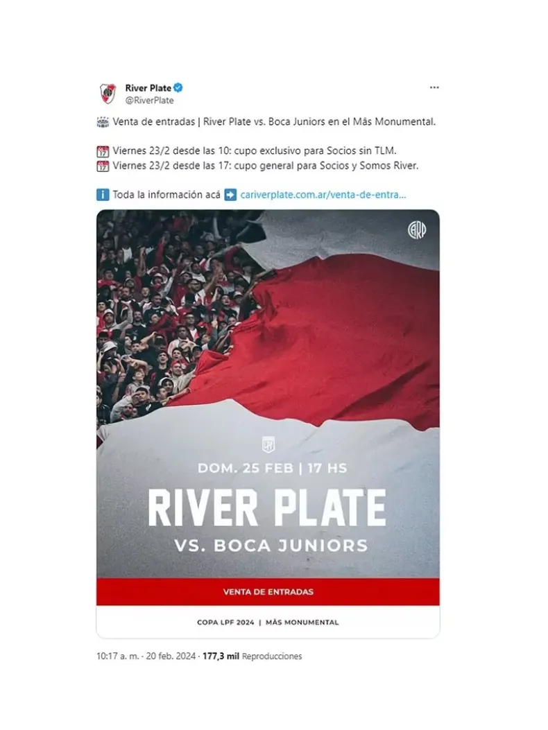 La venta de boletos comenzará a las 10:00 horas para los "Socios sin Tu Lugar" en el Monumental, quienes tendrán prioridad sobre otros seguidores. Por su parte, los miembros de la comunidad "Somos River" podrán adquirir sus entradas a partir de las 17 horas del mismo día, siempre sujeto a la disponibilidad de cupos. Sin embargo, debido a la alta demanda prevista y la limitación de asientos, es poco probable que queden entradas disponibles para el público en general.