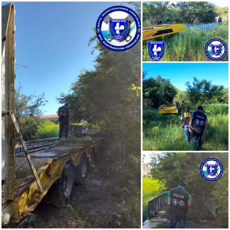 Colaboraron en el operativo las divisiones de Sustracción Vehicular, Investigaciones Complejas y Vialidad Provincial, quienes confirmaron el estado del carretón. Se identificaron seis remaches cortados en su frente, donde se presume debería haber placas de identificación.