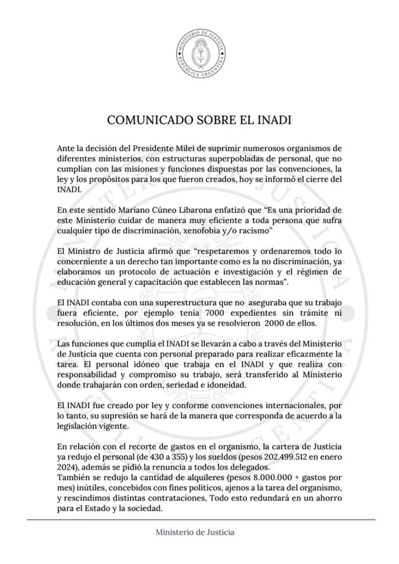Tras los anuncios del vocero presidencial, desde el Ministerio de Justicia a cargo de Mariano Cúneo Libarona confirmaron que se harán cargo de las funciones que anteriormente eran cumplidas por el INADI. Además, especificaron que absorberán el personal del organismo.
