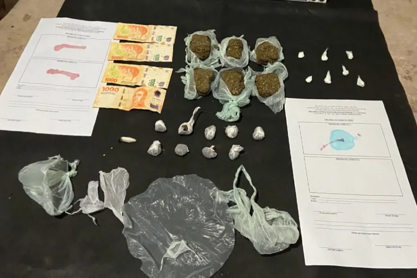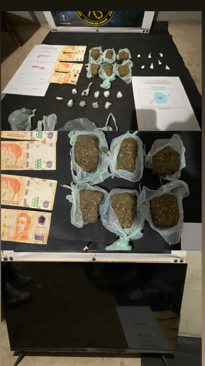 En el operativo, se hallaron 9 bochitas y 6 envoltorios grandes conteniendo un total de 157 gramos de marihuana, así como también, 7 dosis con cocaína que pesaron 3 gramos, varios recortes de bolsas, 4 mil pesos en efectivo y un smart TV de 32 pulgadas de dudosa procedencia.