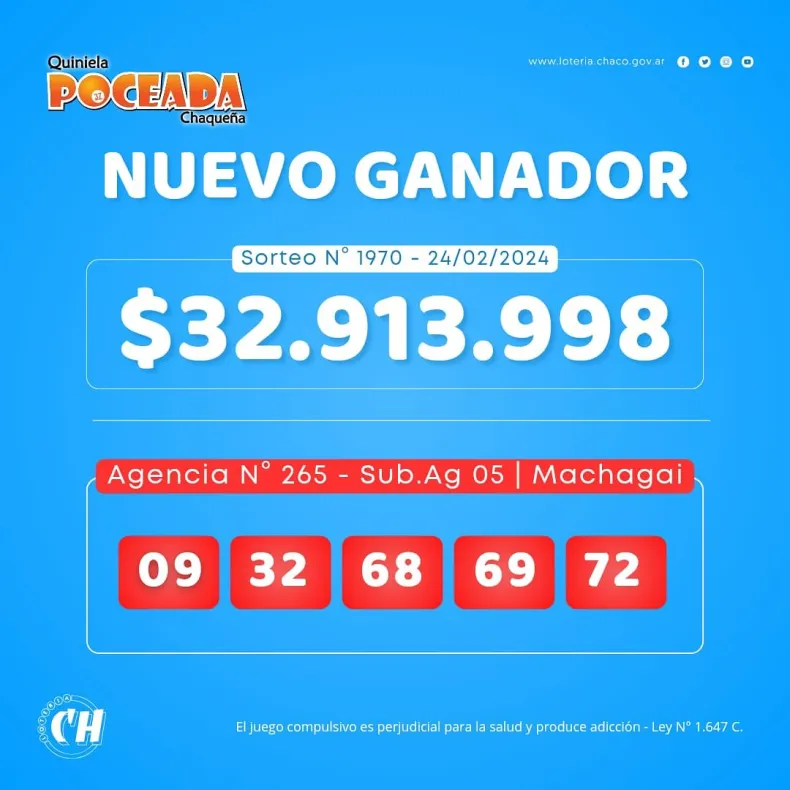En el sorteo de este sábado, la Poceada Chaqueña dejó un sólo ganador. El afortunado se consagró con premio superior a los 32 millones de pesos.