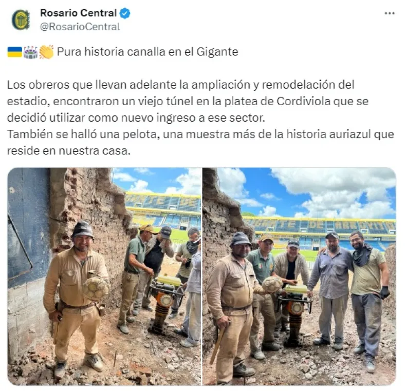 "Pura historia canalla en el Gigante", fueron las primeras palabras que colocó la cuenta oficial del club a través de las redes sociales, donde informó: "Los obreros que llevan adelante la ampliación y remodelación del estadio, encontraron un viejo túnel en la platea de Cordiviola que se decidió utilizar como nuevo ingreso a ese sector".