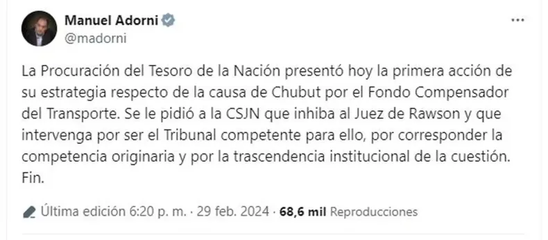 "La Procuración del Tesoro de la Nación presentó hoy la primera acción de su estrategia respecto de la causa de Chubut por el Fondo Compensador del Transporte. Se le pidió a la CSJN que inhiba al Juez de Rawson y que intervenga por ser el Tribunal competente para ello, por corresponder la competencia originaria y por la trascendencia institucional de la cuestión", informó el vocero presidencial, Manuel Adorni.