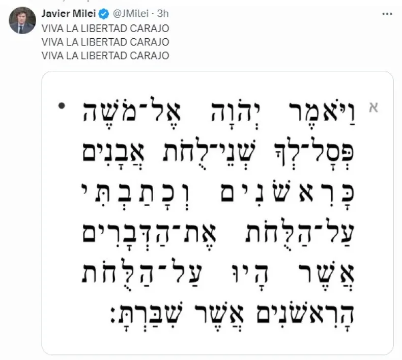 "Dios pide a Moisés que haga nuevas tablas de ley en lugar de las tablas que rompió", es la traducción del fragmento del Éxodo 34:1-25 que compartió el líder de La Libertad Avanza (LLA).