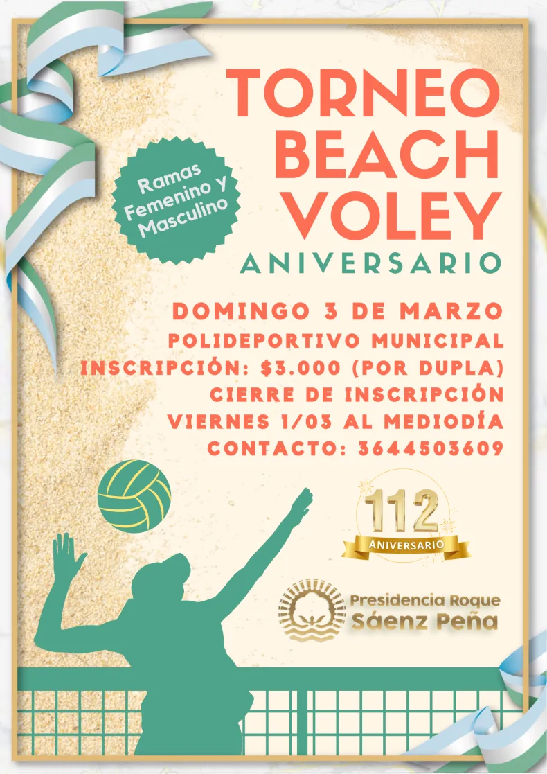La actividad forma parte del cronograma de actividades por el 112° Aniversario de Presidencia Roque Sáenz Peña, el próximo domingo 3 de marzo se realizará en el polideportivo municipal, el torneo "Beach Voley Aniversario".