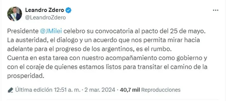 En la misma línea, el gobernador de la provincia del Chaco, Leandro Zdero, expresó al respecto: "Presidente @JMilei celebro su convocatoria al pacto del 25 de mayo. La austeridad, el diálogo y un acuerdo que nos permita mirar hacia adelante para el progreso de los argentinos, es el rumbo".