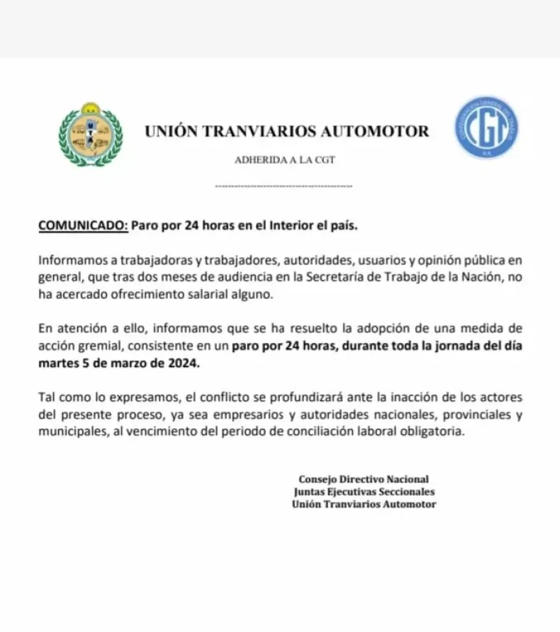 Tras concluir sin acuerdo la instancia de conciliación obligatoria dictaminada por la Secretaría de Trabajo, la Unión Tranviarios Automotor (UTA) anunció un paro de 24 horas para el martes 5 de marzo en el interior del país, la medida afecta a la provincia del Chaco.