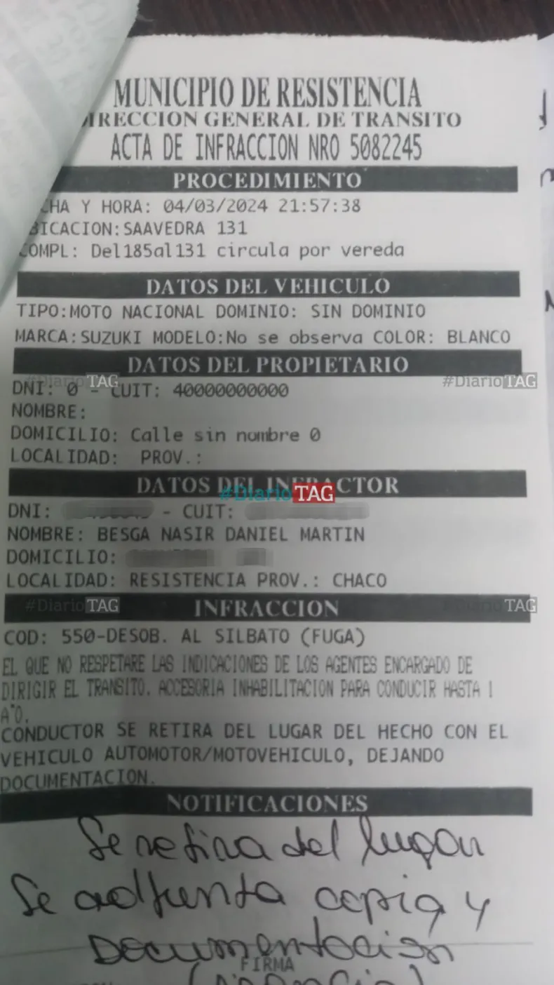 Diario Tag se comunicó con Darío Sardi, subsecretario de Tránsito y Transporte de la Municipalidad de Resistencia que se encontraba en el lugar y detalló que el abogado "no solo que justificaba su accionar dando a entender que él sabía lo que hacía porque era profesional del Derecho, sino que argumentaba que él debía circular por la vereda porque la calle estaba cortada por obras de bacheo, que no podía meter su auto en el garaje, un montón de argumentos que no tienen nada que ver".