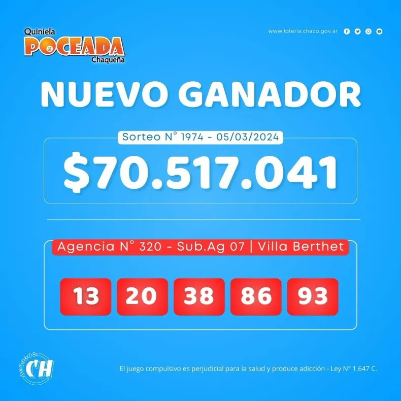 Se trató del sorteo número 1974 de la Poceada Chaqueña y en esta ocasión el ganador recibió un total de $ 70.517.041.