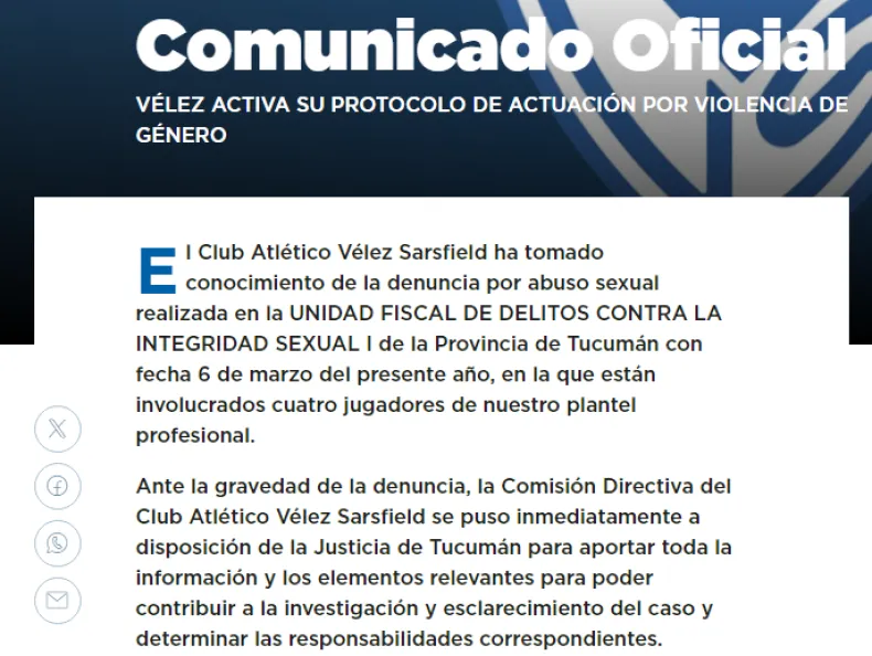"El Club Atlético Vélez Sarsfield ha tomado conocimiento de la denuncia por abuso sexual realizada en la UNIDAD FISCAL DE DELITOS CONTRA LA INTEGRIDAD SEXUAL I de la Provincia de Tucumán con fecha 6 de marzo del presente año, en la que están involucrados cuatro jugadores de nuestro plantel profesional.
