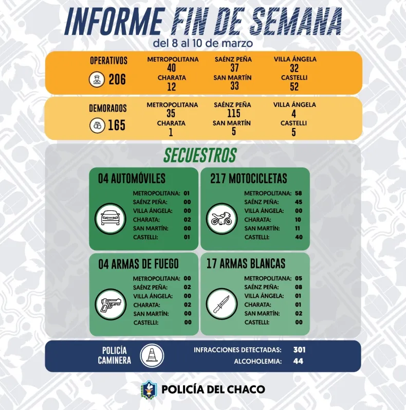 Durante este fin de semana, los policías de toda la provincia realizaron diversos operativos para preservar el orden y la seguridad. Se plasmaron un total de 206 dispositivos en todo el territorio que terminaron con más 208 motos incautadas por infracciones al código y 22 que tenían pedidos de secuestro.